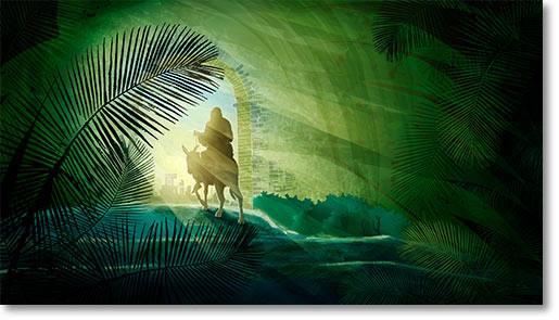 Jesus on a young colt passes by.